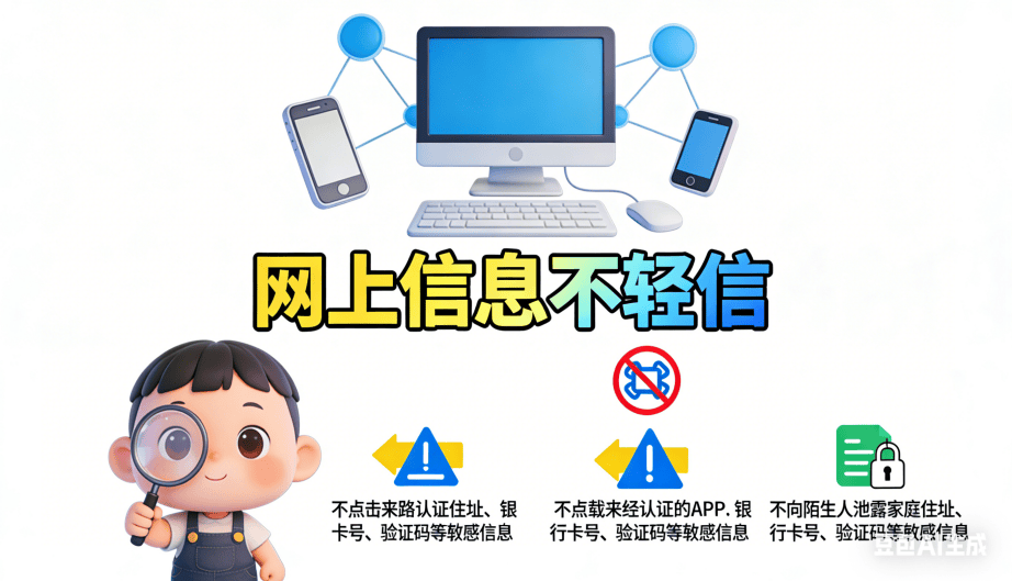 教育孩子提高收集平安性,做到“”:不点击来不明的链接,不下载未经认证的 APP,不向目生人泄露家庭住址、银行卡号、验证码等消息,谨防落入电信诈骗圈套。
